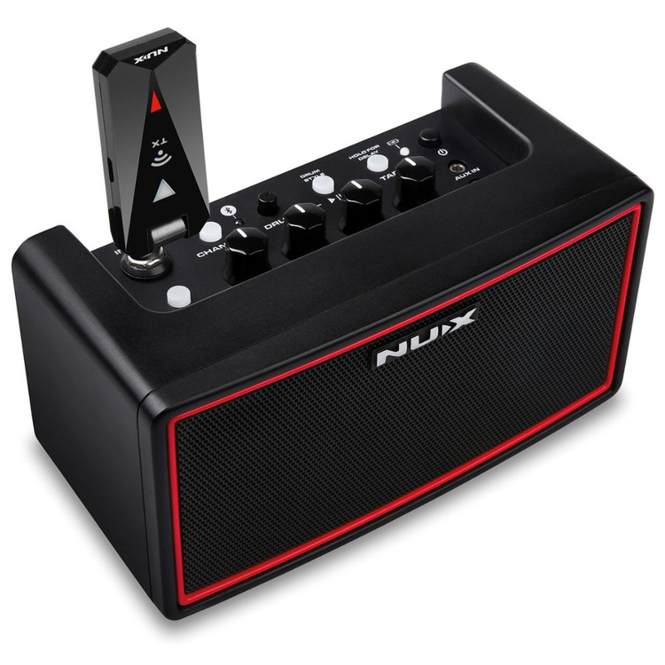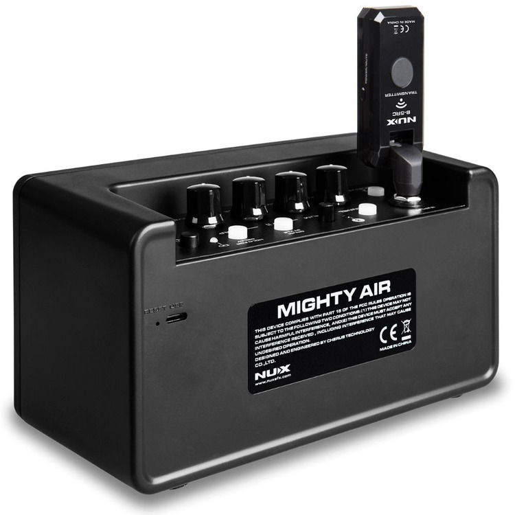 NUX Mighty Air is a wireless stereo guitar / bass amplifier with Bluetooth connectivity and an inbuilt re-chargeable battery.